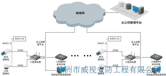 根據(jù)店鋪現(xiàn)場(chǎng)實(shí)際情況,方案需使用現(xiàn)有的網(wǎng)絡(luò)資源,同時(shí)借用ADSL線路和公司網(wǎng)絡(luò)進(jìn)行網(wǎng)絡(luò)數(shù)據(jù)傳輸,實(shí)現(xiàn)各級(jí)網(wǎng)絡(luò)監(jiān)控系統(tǒng)的全部功能。監(jiān)控方案需在總公司設(shè)置總監(jiān)控中心,使之成為一個(gè)網(wǎng)絡(luò)監(jiān)控站,可隨意調(diào)看系統(tǒng)中任一店鋪的任一畫面。