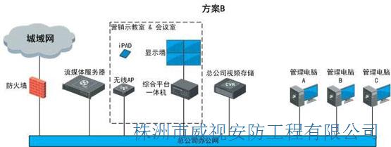 方案B,可通過對(duì)訪問人員的授權(quán),實(shí)現(xiàn)對(duì)分布在全國(guó)各地營(yíng)業(yè)店的不同訪問權(quán)限;同時(shí)可在總部?jī)?nèi)部搭建一套營(yíng)銷示教系統(tǒng),總部銷售總監(jiān)、銷售培訓(xùn)主管可以利用該平臺(tái),對(duì)各區(qū)域督導(dǎo)進(jìn)行實(shí)戰(zhàn)培訓(xùn),系統(tǒng)可通過iPAD直接控制顯示墻,方便授課人員靈活操控。系統(tǒng)架構(gòu)圖如下: